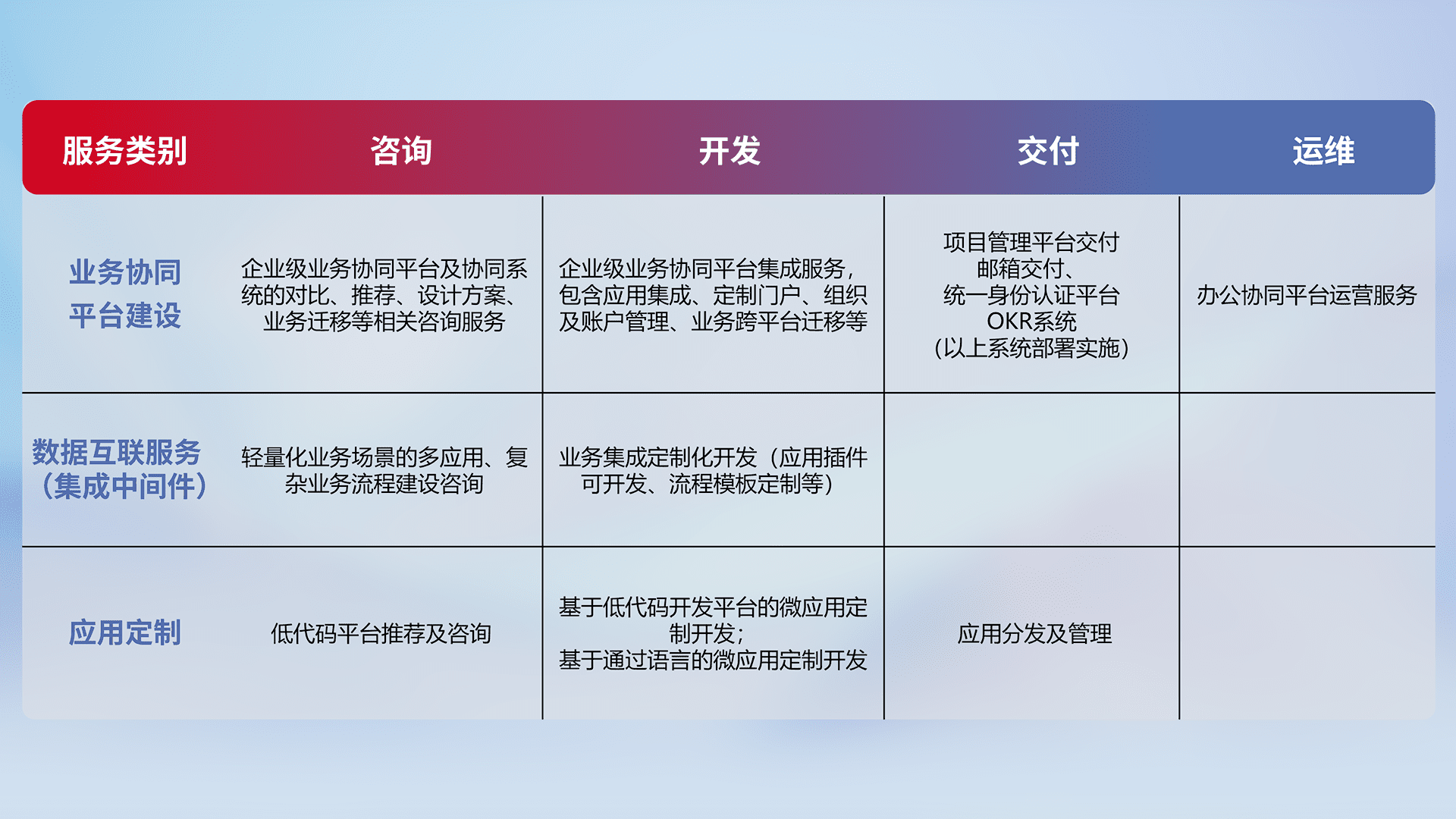 针对钉钉、、企微、、、、IDaas等平台级产品提供产品的规划、、、方案、、、交付、、、、定制化开发等服务,,,实现如统一协同办公、、智能客户服务、、、、混合会议管理、、智能数据查询、、、等业务场景,,实现数字化转型。。