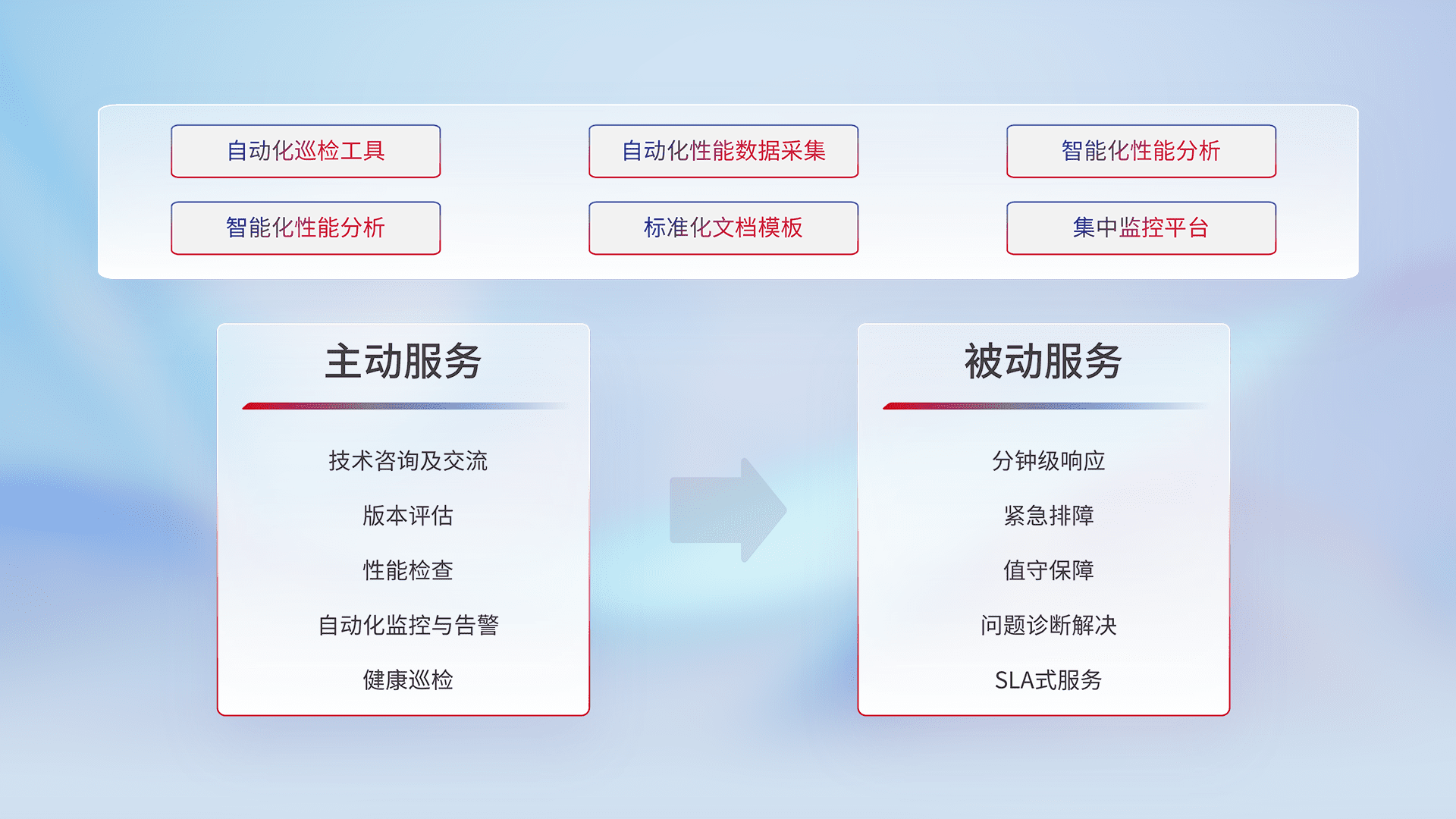 智能化工具和标准化文档,,,保障服务质量,,,提供主动服务(包含技术咨询、、版本评估、、性能检查、、、自动化监控与告警、、、、健康巡检)和被动服务包含(分钟级响应、、紧急排障、、值守保障、、问题诊断解决、、、、SLA服务)。。。